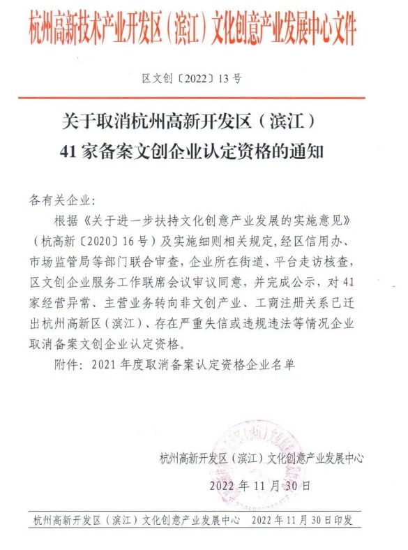 關(guān)于取消41家備案文創(chuàng)企業(yè)認(rèn)定資格的通知