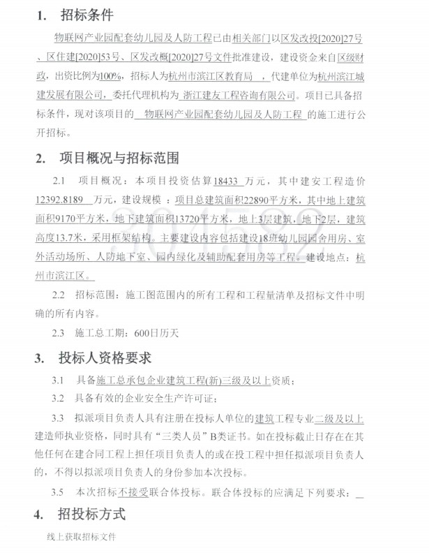 物聯網產業園配套幼兒園及人防工程項目施工單位招標公告