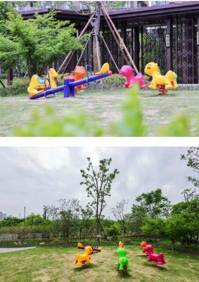 公園的中心位置設置多功能陽光草坪,草坪上設置蹺蹺板、搖搖馬等兒童友好設施,是開展戶外休閑活動的好地方。草坪旁配建了現代特色的連廊,為居民提供休憩的場所。