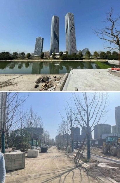 “目前地上部分園路鋪裝完成85%,綠化完成80%,人行景觀天橋主體已基本完成,市政道路基層完成。”施工現場負責人介紹,“地下部分的土建、裝修及安裝工程正處于收尾階段。”