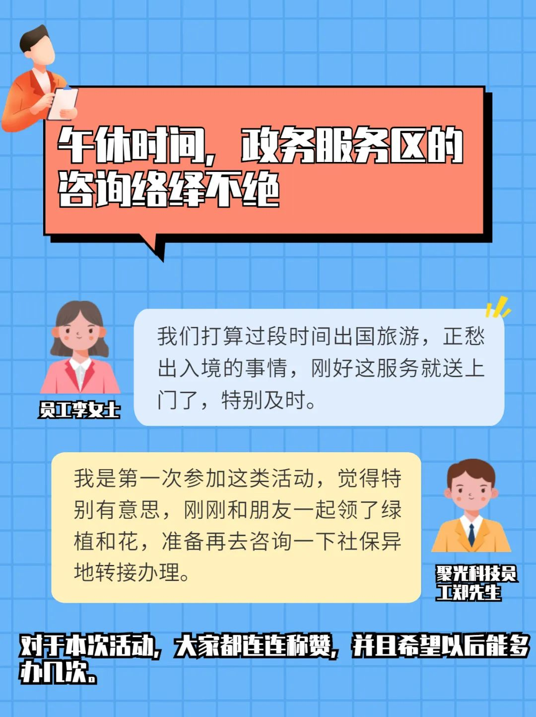 活動現(xiàn)場,窗口工作人員為園區(qū)企業(yè)提供了“點對點、面對面、一對一”的精準服務(wù),如出入境辦理、居住證申請、社保、市民卡、不動產(chǎn)、稅務(wù)等各類日常咨詢,以及人事代理和流動人口登記服務(wù),惠及200余人次,移動審批上門服務(wù)的形式也受到企業(yè)員工及周邊群眾的一致好評。