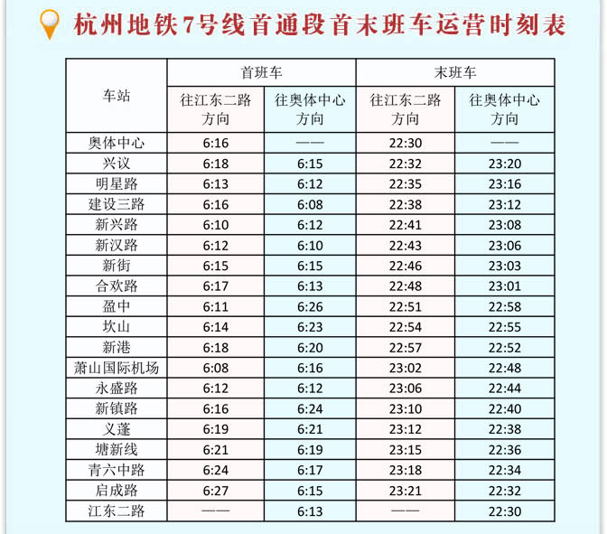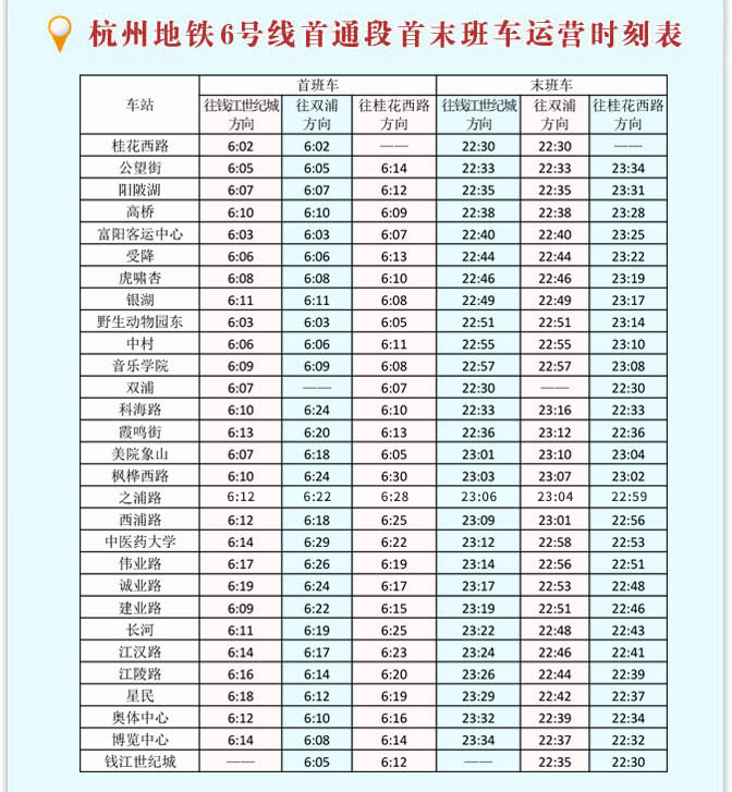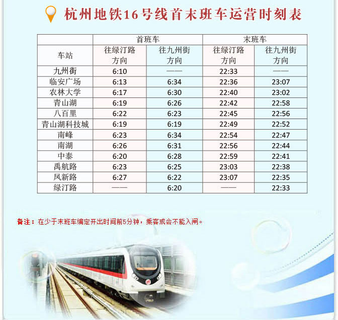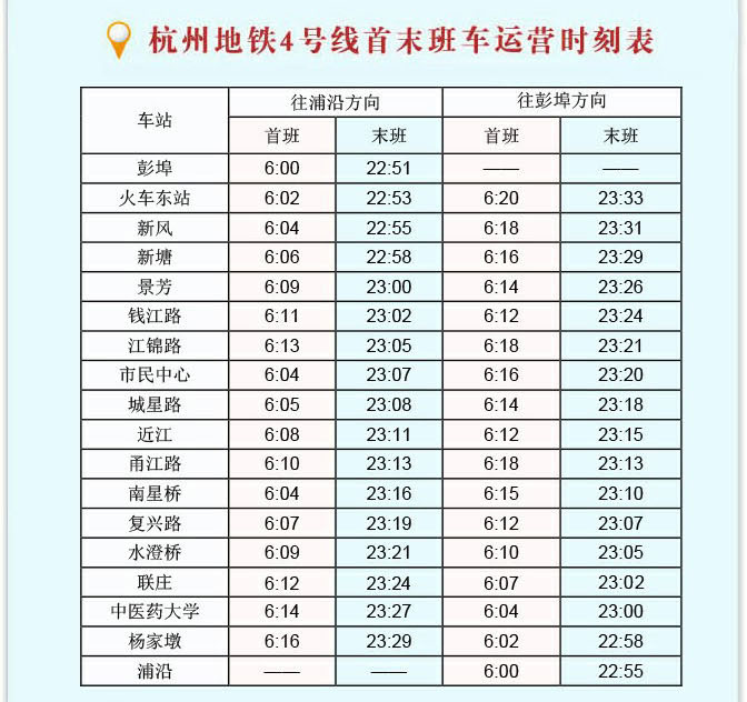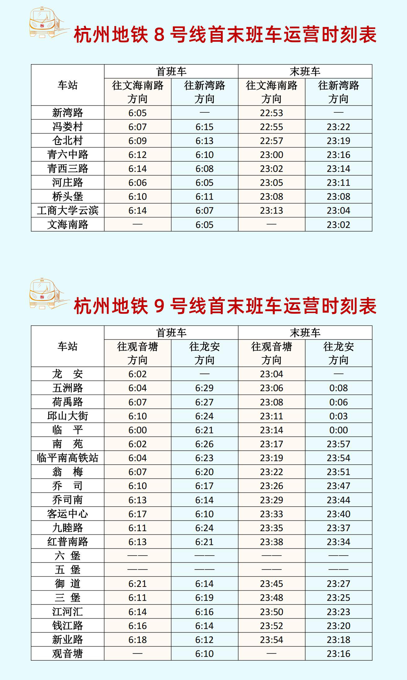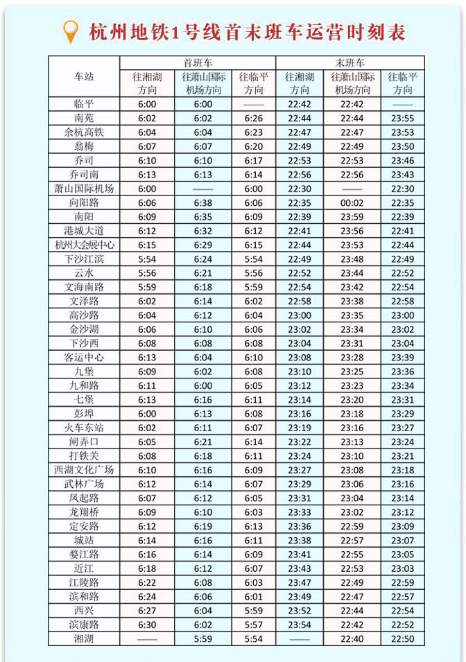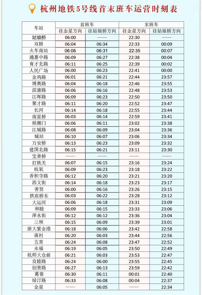 杭州地鐵首末班車運(yùn)營時(shí)刻表