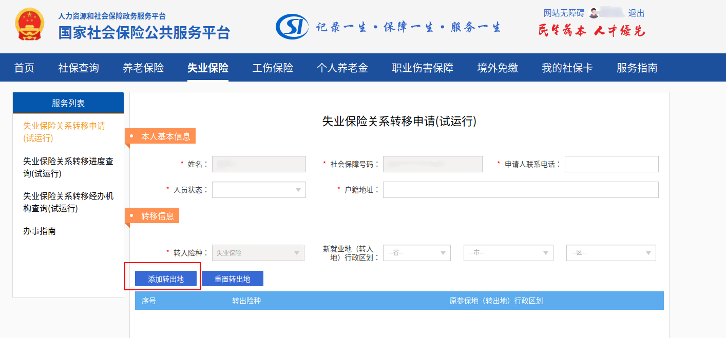 填寫相關信息并點擊“添加轉出地”,填寫完畢后申請提交轉移。
