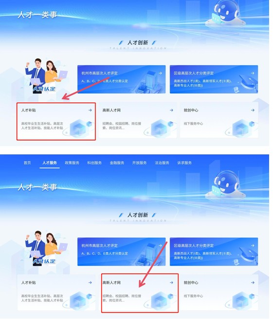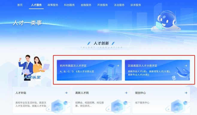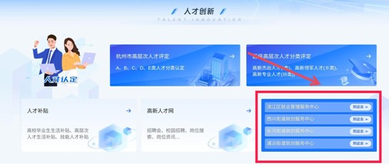 我們的人才服務分為三大板塊,分別是人才創新、人才創業和人才生活。在人才創新板塊,群眾根據實際情況可以進行杭州市高層次人才評定和區級高層次人才分類評定。