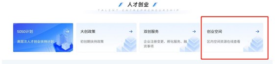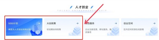 我們的人才創業板塊集合了各類就業創業政策、空間咨詢以及相關初創企業的高頻審批事項入口。點擊“5050計劃”和“大創政策”板塊,可跳轉“5050計劃”項目申報頁面和政策服務頁面。