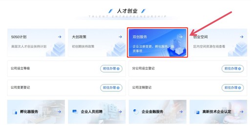 點擊“雙創服務”,即可查看針對初創企業可能會需要的各類審批事項入口,點擊最下方板塊,從左到右依次可快速找到孵化器認定、高新人才網、企業融資、高新技術企業認定