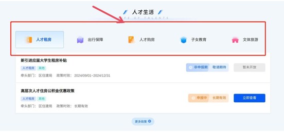 最后是“人才生活”模塊,濱濱整理了人才租房、出行保障、人才購房、子女教育、文體旅游五個方面的政策,大家可以根據自己的實際情況,找到匹配的政策,實現快速兌付。