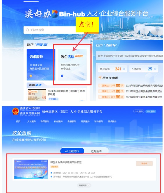 登陸“濱好辦”(如何訪問和登陸,指路→ https://mp.weixin.qq.com/s/8D1Ksiu_-RbT4QCEQ4GG7g),首頁找到“政企活動”,點開即可查看正在進行中/待開始的活動。