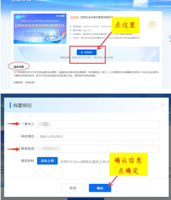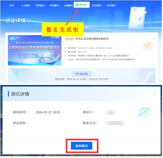 看到心儀的活動怎么報名?點擊該活動跳轉至活動詳情頁,點擊“我要報名”,如果是個人登陸,系統會默認填寫您為參會人,如果是法人登陸,則根據登陸的賬號默認參會人及聯系方式(如用經辦人法人賬號登錄,則參會人默認為經辦人),點擊編輯框可修改參會人及聯系方式信息。確認參會人信息點擊“確認”即報名成功。