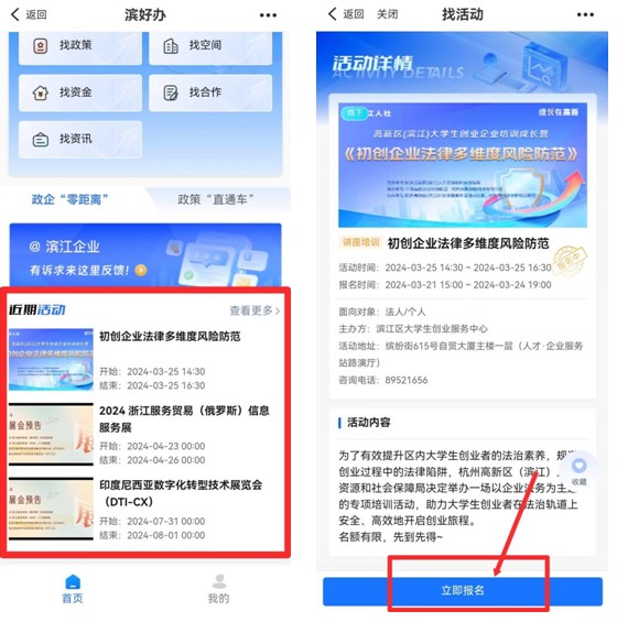 同樣的,在手機端操作也很方便哦,打開“浙里辦”登陸“濱好辦”,活動報名一手掌握。