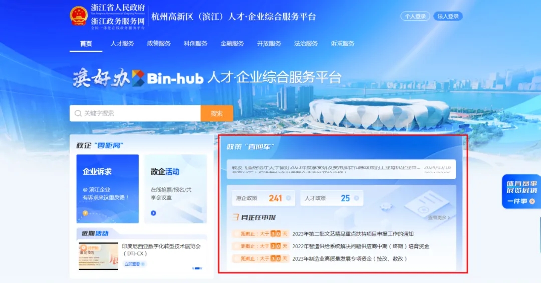 在“濱好辦”首頁政策“直通車”模塊中,我們將政策的最新通知、當(dāng)前的政策總數(shù)及當(dāng)月正在申報的政策進行展示。點擊輪播通知可跳轉(zhuǎn)至對應(yīng)資訊詳情信息內(nèi)容頁,點擊政策可以直接跳轉(zhuǎn)至對應(yīng)的政策服務(wù)頁面。