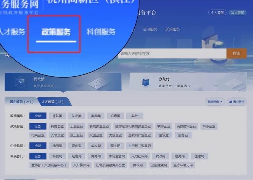 從首頁點擊“政策服務(wù)”或“找政策”,來到政策服務(wù)板塊,頁面顯示當(dāng)前上架的所有政策條目,可以通過標(biāo)簽篩選想要查找的政策,也可以搜索關(guān)鍵字進行全域搜索,找到需要的政策條目,點擊立即查看進入政策詳情頁。