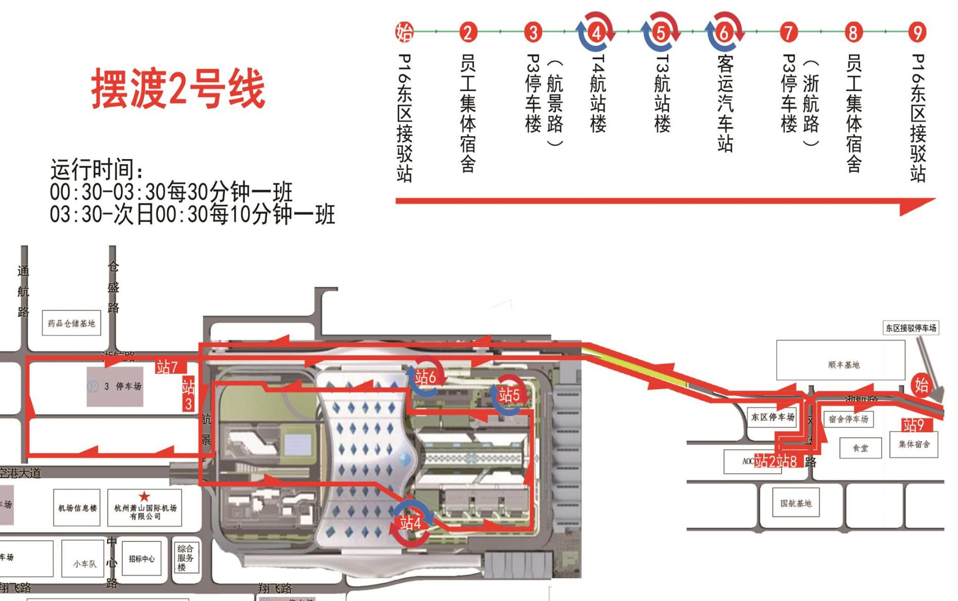 P16東區接駁站→員工集體宿舍→P3停車樓(航景路)→T4航站樓→T3航站樓→汽車客運站→P3停車樓(浙航路)→員工集體宿舍→P16東區接駁站。
