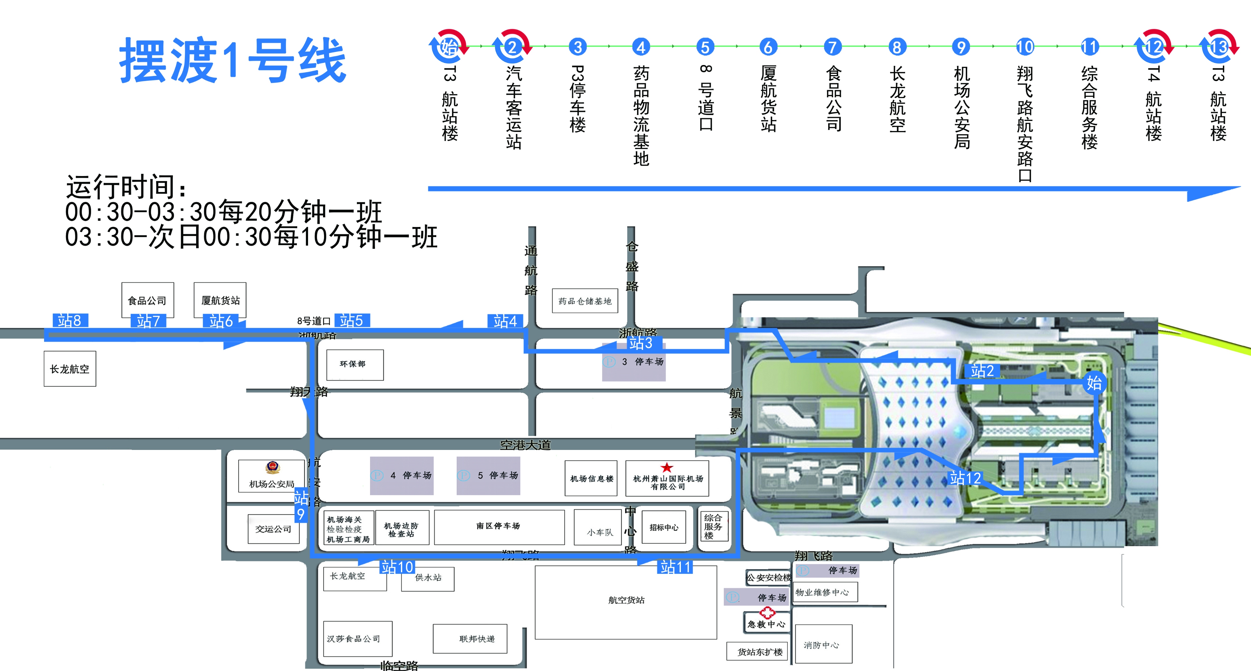 T3航站樓→汽車客運站→P3停車樓→藥品物流基地→8號道口→廈航貨站→食品公司→長龍航空→機場公安局→翔飛路航安路口→綜合服務樓→T4航站樓→T3航站樓。