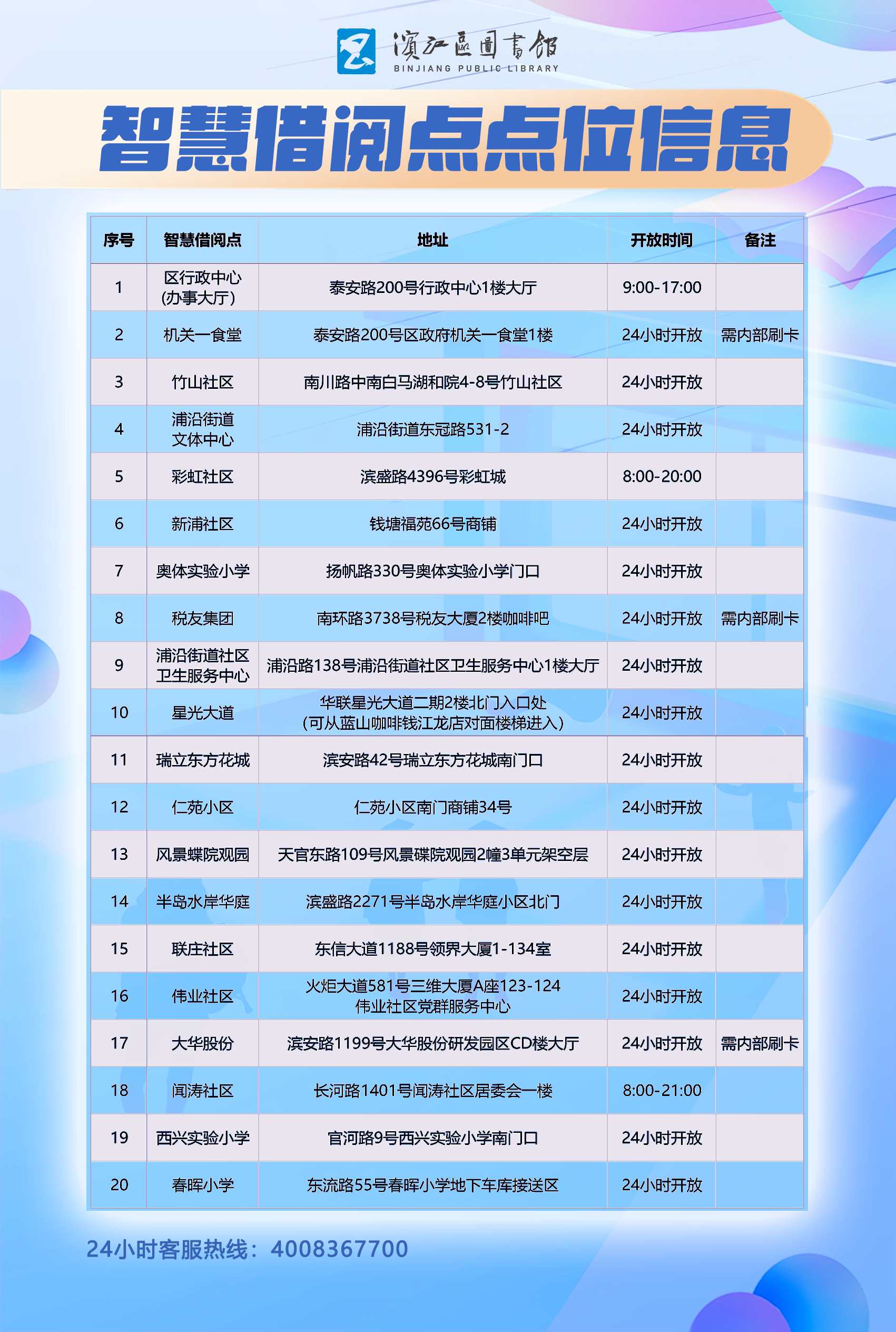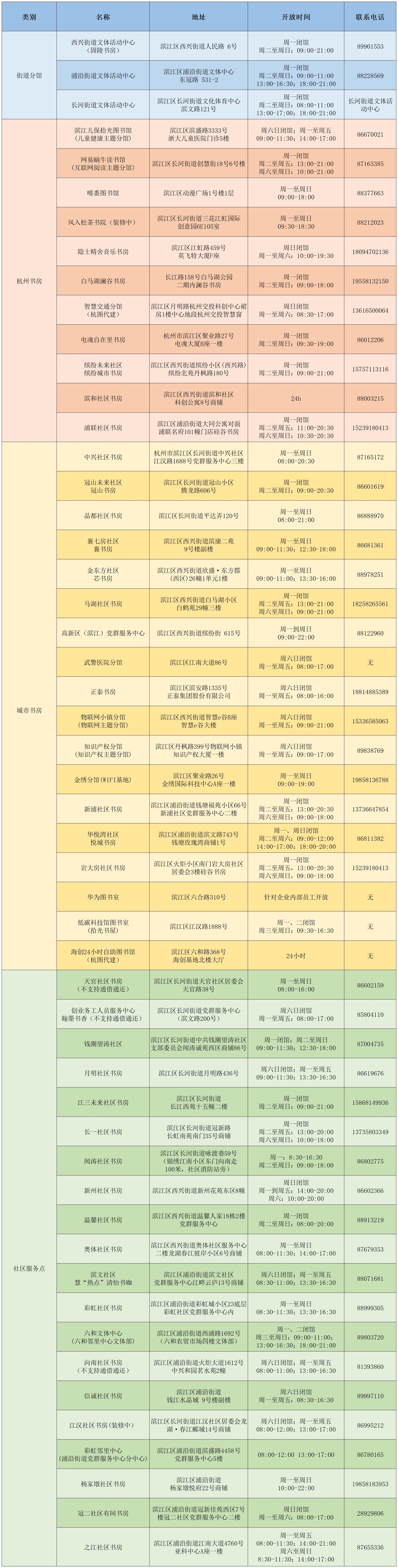 濱江區圖書館各分館、城市書房及智慧借閱點一覽表
