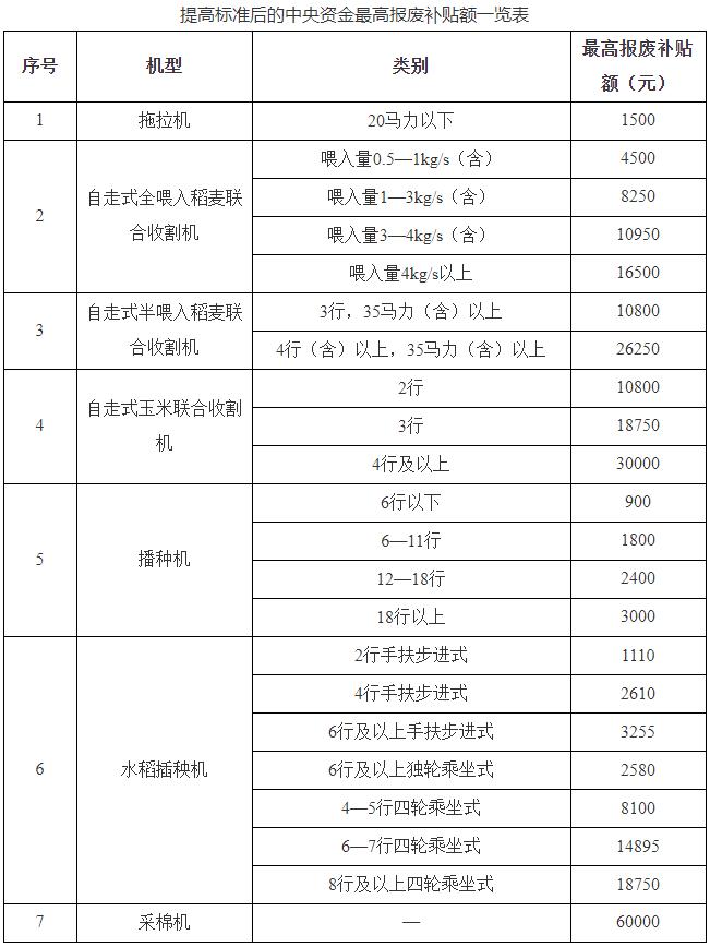 各省、自治區、直轄市及計劃單列市農業農村(農牧)廳(局、委)、發展改革委、財政廳(局),新疆生產建設兵團農業農村局、發展改革委、財政局,北大荒農墾集團有限公司,廣東省農墾總局: 為深入貫徹中央財經委員會第四次會議精神,落實《國務院關于印發〈推動大規模設備更新和消費品以舊換新行動方案〉的通知》(國發〔2024〕7號)、《國家發展改革委、財政部印發〈關于加力支持大規模設備更新和消費品以舊換新的若干措施〉的通知》(發改環資〔2024〕1104號)部署要求,持續實施好農業機械報廢更新補貼政策,加力推進老舊農業機械報廢更新,加快農業機械結構調整,經商商務部,現就相關工作補充通知如下。 一、擴大報廢補貼范圍 各省可在《農業農村部辦公廳、財政部辦公廳關于加大工作力度持續實施好農業機械報廢更新補貼政策的通知》(農辦機〔2024〕4號,以下簡稱《通知》)規定的拖拉機、播種機、聯合收割機(含糧棉油糖等作物聯合收割所用機械)、水稻插秧機、農用北斗輔助駕駛系統、機動噴霧(粉)機、機動脫粒機、飼料(草)粉碎機、鍘草機等9個農機種類基礎上,聚焦保障糧食和重要農產品穩定安全供給,結合實際自行確定不超過6個機具種類新增納入報廢補貼范圍。新增納入報廢補貼范圍的機具種類,按《通知》規定測算確定報廢補貼標準,單臺最高報廢補貼額不超過2萬元。 二、提高報廢補貼標準 報廢20馬力以下拖拉機,單臺最高報廢補貼額由1000元提高到1500元;報廢聯合收割機、水稻插秧機、播種機并新購置同種類機具,按不超過50%提高報廢補貼標準,單臺最高報廢補貼額不超過3萬元;報廢并更新購置采棉機,單臺最高報廢補貼額由3萬元提高到6萬元(詳見附件)。除20馬力以下拖拉機外,對只申請報廢不新購置的,繼續執行《通知》規定的報廢補貼標準。對自《通知》印發之日起提交報廢補貼申請的,按調整后的報廢補貼標準執行,對已領取報廢補貼的,補齊差額部分補貼。 三、加強資金使用管理 根據《關于加力支持大規模設備更新和消費品以舊換新的若干措施》要求,國家發展改革委直接向地方安排超長期特別國債資金,支持各地實施農業機械報廢更新,資金按照總體9:1的原則實行央地共擔,東部、中部、西部地區中央承擔比例分別為85%、90%、95%。各省級財政根據中央資金分配情況按比例安排配套資金。各省有關部門要管好用好支持農業機械報廢更新的超長期特別國債資金和今年中央財政已下達的農業機械報廢更新相關資金,支持老舊農機報廢補貼和報廢并購置同種類機具更新補貼兌付,扎實有力推進農業機械報廢更新工作。要優化補貼申請和資金兌付流程,增加結算批次,加快補貼兌付,年底前將符合條件的補貼申請及時完成錄入和兌付。發現存在利用不正當手段騙取補貼資金等違法行為的,要依法依規嚴肅處理,涉嫌犯罪的移送司法機關依法嚴厲查處。報廢更新農用北斗輔助駕駛系統的,應符合國家有關規定要求。 四、完善回收拆解工作流程 各省要結合實際,針對擴大范圍、提高標準可能帶來的監管困難和實施風險,進一步優化完善農機報廢回收拆解工作流程。對于各省新增納入報廢補貼范圍的農機種類,要充分利用好現有回收拆解體系,做好對新增報廢農機種類的回收拆解工作;對于農用北斗輔助駕駛系統,要在確保報廢設備唯一性及數據安全等的基礎上,制定符合本省實際的回收拆解標準及方案。鼓勵各省立足便民利民和提高效率,開展農機報廢回收拆解創新探索,允許根據實際將回收環節和拆解環節分開。 五、強化政策實施保障 各省要高度重視,堅持實事求是、穩步推進原則,指導基層落實好農業機械報廢更新補貼政策。要按照《通知》和本補充通知要求,認真做好標準制定、補貼額測算等工作,盡快制定出臺本省農業機械報廢更新補貼實施方案并及時向社會公布。要加強風險防范,對于提高補貼標準的機具要專門制定監管措施并進行嚴格監管;對于以購置新機為前提的報廢農機種類,在申領報廢補貼時,農民和農業生產經營組織應提供購置同種類新農機的有效證明,各地農業農村、財政部門要按職責嚴格做好審核工作,并將審核情況抄送當地發展改革部門。要加強農機報廢回收拆解體系建設,加快農機回收拆解企業培育和網點布局。要加大政策宣傳和解讀,回應社會關切,進一步提升政策知曉度和實施透明度。要加強補貼業務培訓和警示教育,提高工作人員業務素質和風險防控能力。要及時跟進政策實施情況,發現問題及時反饋及時處理,適時總結推廣先進經驗和典型做法。 本補充通知明確的擴大報廢補貼范圍、提高報廢補貼標準政策實施期限截止到2024年12月31日,如有變動將另行通知。請于2025年1月10日前,將本省安排超長期特別國債資金支持農業機械報廢更新補貼的政策實施情況(含資金安排數、申請錄入數、實際兌付數、報廢更新臺套數等),報送農業農村部農業機械化管理司、國家發展改革委資源節約和環境保護司、財政部農業農村司。 附件:提高標準后的中央資金最高報廢補貼額一覽表 農業農村部辦公廳 國家發展改革委辦公廳 財政部辦公廳 2024年9月5日 | |||