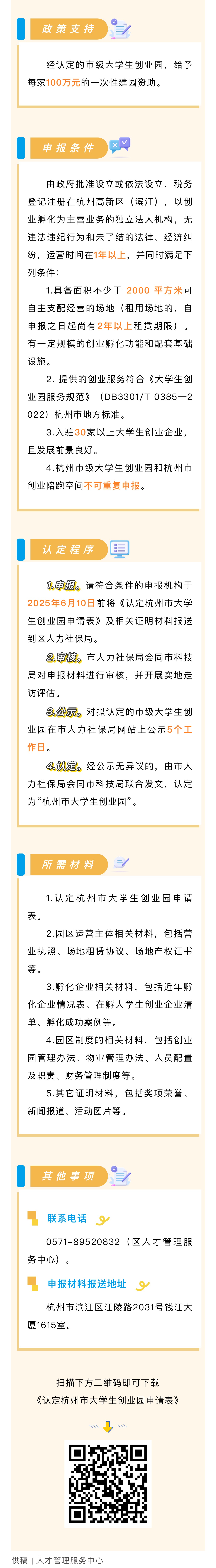 為貫徹落實《杭州市人民政府辦公廳關于印發(fā)杭向未來·大學生創(chuàng)新創(chuàng)業(yè)三年行動計劃(2023—2025年)的通知》(杭政辦函〔2023〕45號),進一步推進市級大學生創(chuàng)業(yè)園建設,充分發(fā)揮示范引領作用,現(xiàn)開展 2025年度市級大學生創(chuàng)業(yè)園推薦申報工作。有關事項通知如下: