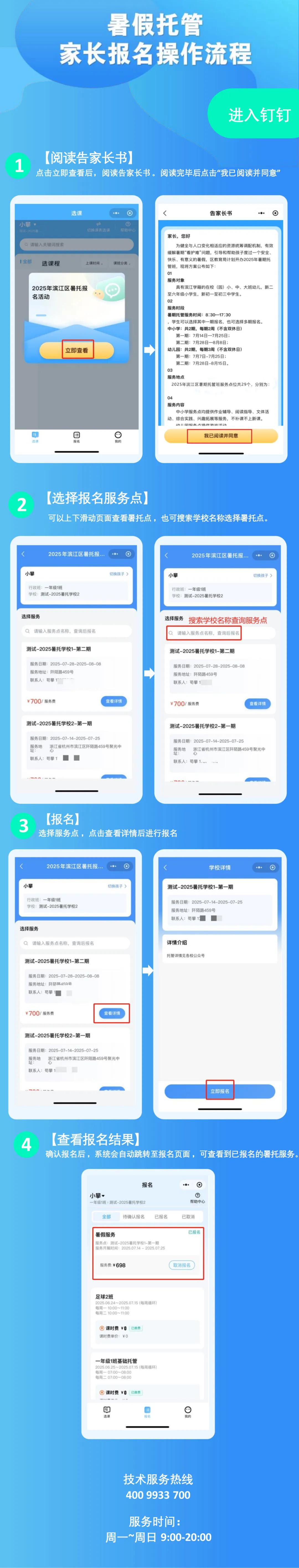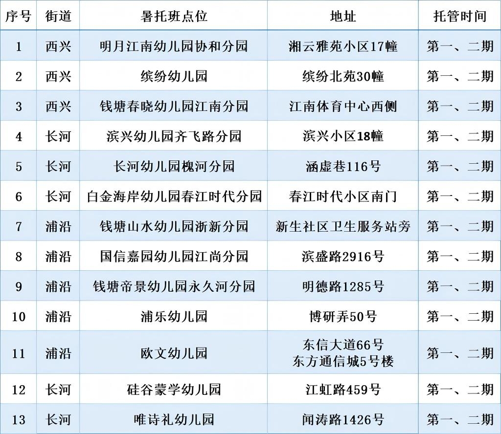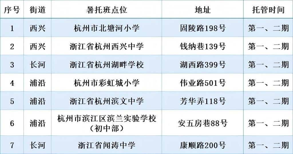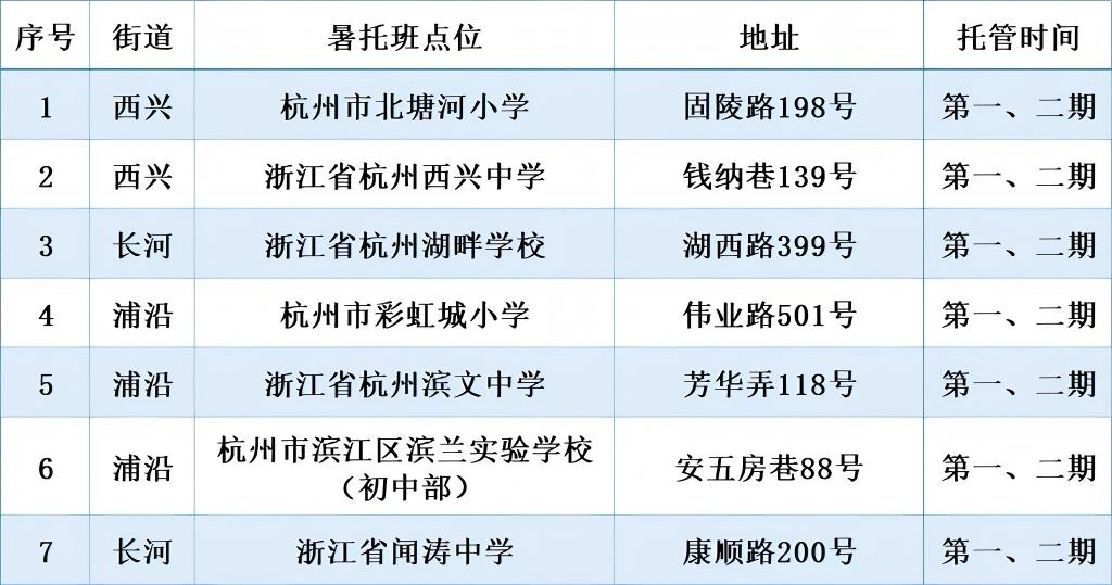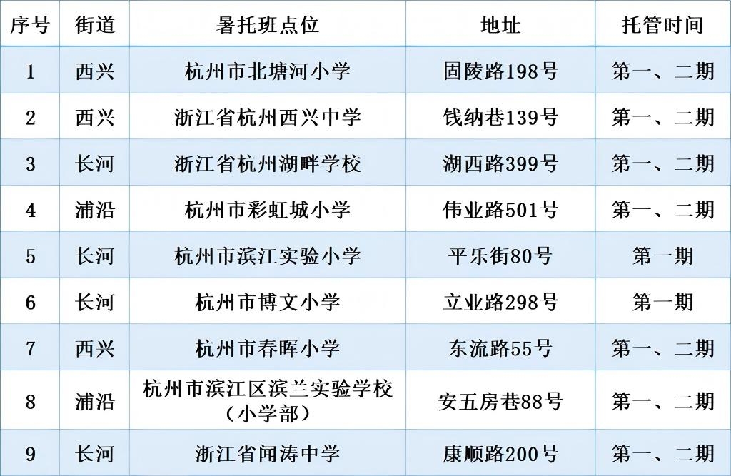 中小學(xué):共2期,每期2周(不含雙休日) 第一期:7月14日—7月25日 第二期:7月28日—8月8日 幼兒園:共2期,每期3周(不含雙休日) 第一期:7月7日—7月25日 第二期:7月28日—8月15日 三、服務(wù)地點(diǎn) 2025年濱江區(qū)暑期托管班服務(wù)點(diǎn)位共29個(gè),分別為: (1)中學(xué)7個(gè): (2)小學(xué)9個(gè): (3)幼兒園13個(gè): 四、服務(wù)內(nèi)容 中小學(xué)服務(wù)點(diǎn)均提供作業(yè)輔導(dǎo)、閱讀指導(dǎo)、文體活動(dòng)、綜合實(shí)踐、興趣拓展等服務(wù),不補(bǔ)課不上新課。 幼兒園服務(wù)點(diǎn)提供游戲活動(dòng)。 五、服務(wù)收費(fèi) 堅(jiān)持“公益、自愿”原則,適當(dāng)收取費(fèi)用,中小學(xué)收費(fèi)標(biāo)準(zhǔn)700元/人/期(含餐費(fèi))或500元/人/期(不含餐費(fèi)),公辦幼兒園收費(fèi)標(biāo)準(zhǔn)1050元/人/期(含餐費(fèi)),困難家庭可適當(dāng)減免。托管期間午餐采用學(xué)校食堂制作或?qū)W生營養(yǎng)午餐配送方式。 民辦幼兒園收費(fèi)標(biāo)準(zhǔn)詳詢對應(yīng)幼兒園。 六、班額師資 為保障托管服務(wù)順利開展,原則上每班招生不超過40人(幼兒園不超過35人),最終以實(shí)際報(bào)名數(shù)編班;報(bào)名時(shí)間截止時(shí),中小學(xué)如某個(gè)暑托點(diǎn)報(bào)名人數(shù)較少,幼兒園班級(jí)數(shù)不足3個(gè)班的,由區(qū)教育局協(xié)調(diào)相鄰點(diǎn)位共同組班。 七、報(bào)名錄取方式 1.中小學(xué) (1)6月29日9:00-7月2日19:00,家長可根據(jù)下方“濱樂通”登錄和報(bào)名操作,在線填寫報(bào)名表單并提交,逾期不再接收; (2)7月8日報(bào)名學(xué)校公布托管學(xué)生名單(需關(guān)注報(bào)名學(xué)校公眾號(hào)),并根據(jù)公眾號(hào)推送要求到學(xué)校繳費(fèi),簽訂暑托協(xié)議,領(lǐng)取學(xué)員證及了解相關(guān)注意事項(xiàng)。 2.幼兒園 直接向班級(jí)教師報(bào)名,后續(xù)事項(xiàng)由班級(jí)教師通知。
