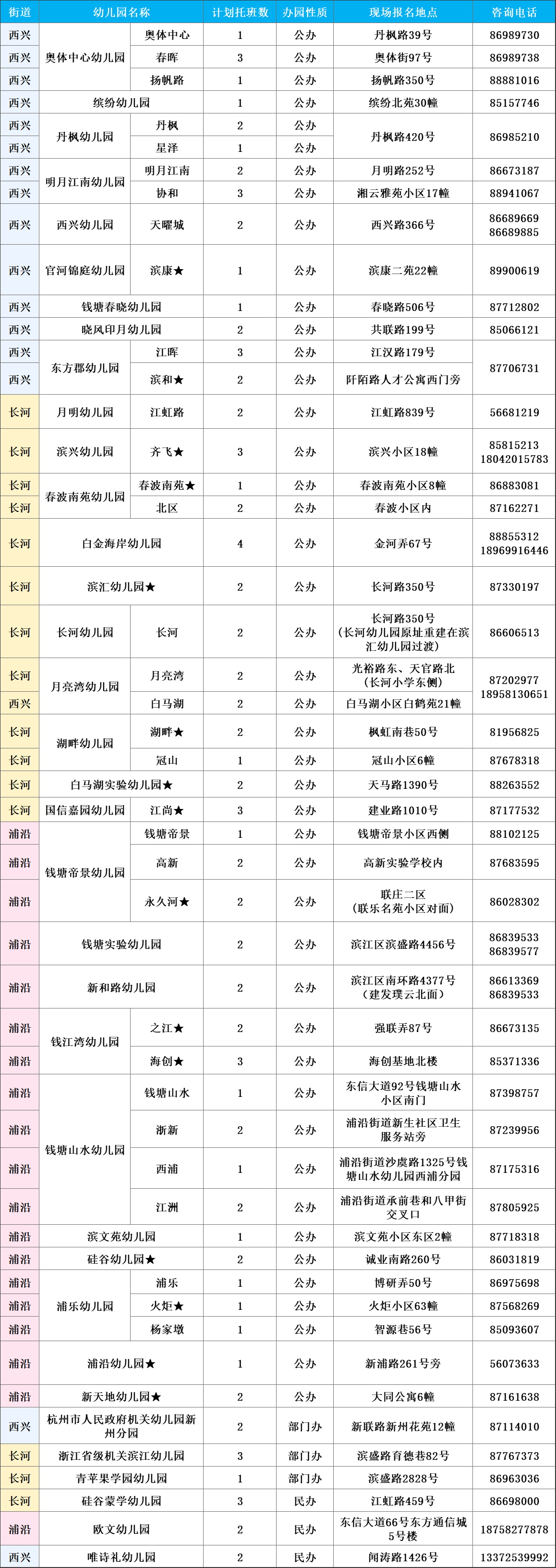 親愛的家長朋友,2025學年濱江區幼兒園托班招生正式開始,具體報名時間、注意事項請大家查收! 現場確認時間 2025年6月14日(星期六) 8:30—11:30 13:00—16:30 溫馨提醒 1. 本次托班招生對象為2022年9月1日至2023年8月31日出生,且符合濱江區入園條件的兒童。 2. 報名兒童需身體健康、具備獨立參加集體活動的能力。 3. 幼兒園托班學位有限,部分幼兒園無空余班級開設托班,報名點接受報名材料不代表最終錄取結果,將根據各園實際情況錄取或統籌調劑安排。 4. 托班入園和小班招生無關聯,2026學年小班入園需回到原服務區報名就讀。 5. 居住地附近幼兒園未開設托班的家長可通過浙里辦“托育一件事”進入“一鍵入托”頁面,查詢家庭周邊的托育機構進行咨詢。 入園“碼上辦” 家長可掃描下方的二維碼進行信息登記,減少現場等待和信息核驗的時間。登記時間:即日起至6月14日。 參與過信息登記及現場報名的家長可在6月18日至27日再次掃碼獲取幼兒園錄取結果。 如幼兒園托班實際報名人數達不到獨立開班要求,則不單獨開班或和其他園區合并開班。 幼兒園報名登記點信息 帶★號的園所提供“就便入園”服務,接受企業注冊地在園區周邊的在職員工子女報名入園,最終將根據實際情況錄取或統籌調劑安排。