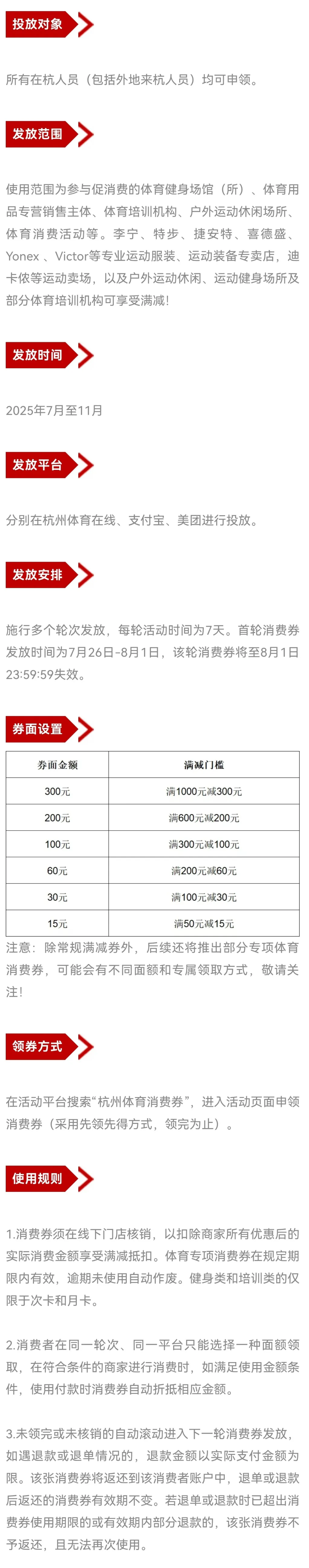 2025年杭州體育消費券即將于7月26日-8月1日首輪發放,覆蓋全市運動消費場景,讓你健身、購物、上課統統省!誰能領?怎么領?在哪用?一起來看。