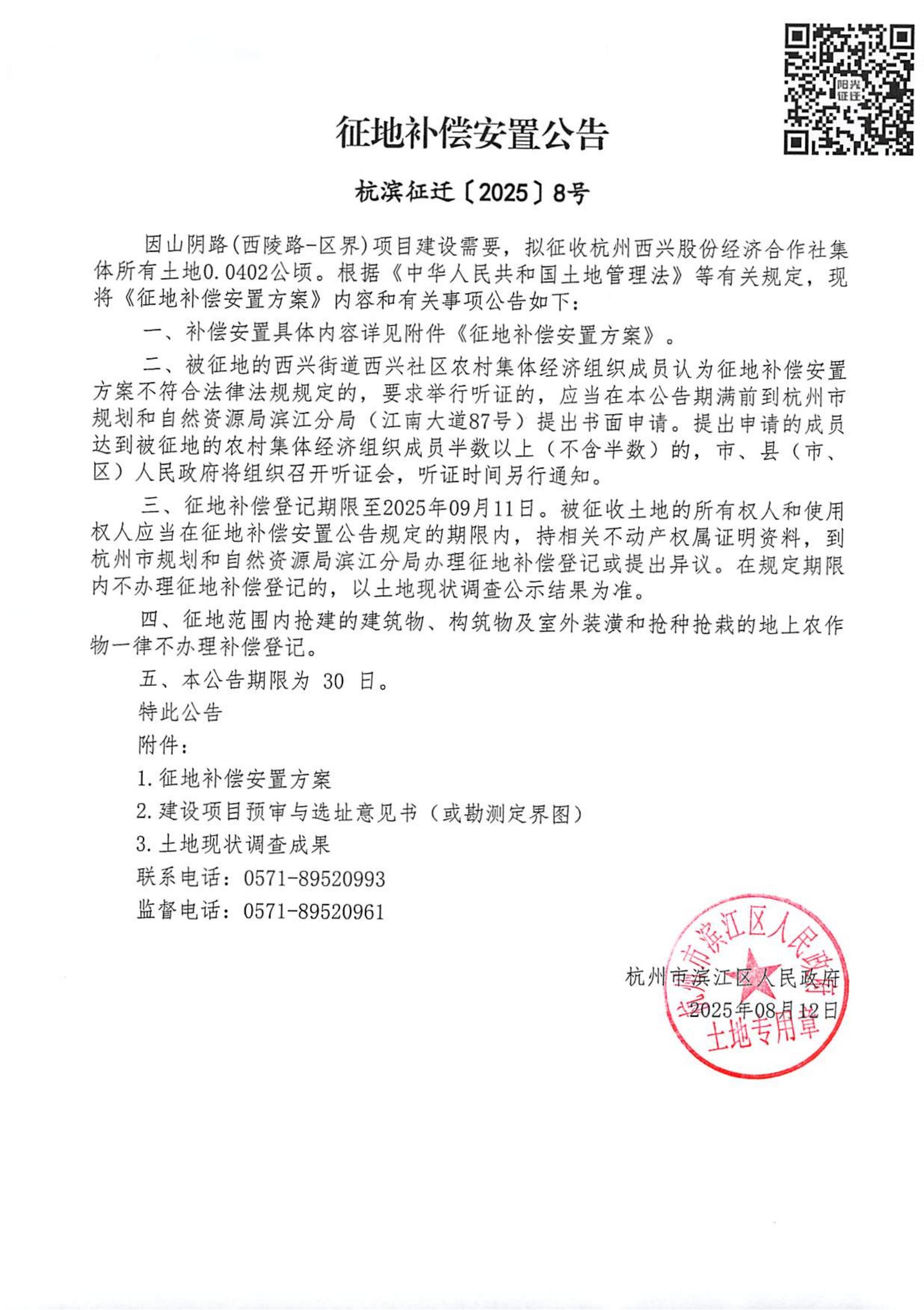征收補(bǔ)償安置公告(杭濱征遷[2025]8號)