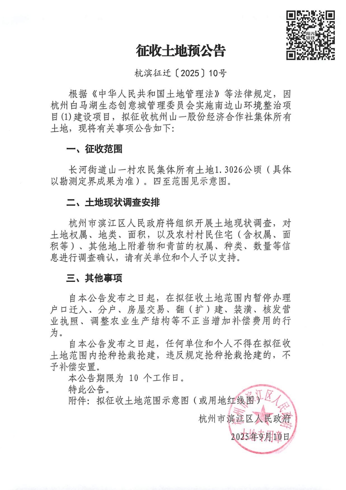 征收土地預(yù)公告(杭濱征遷[2025]10號)