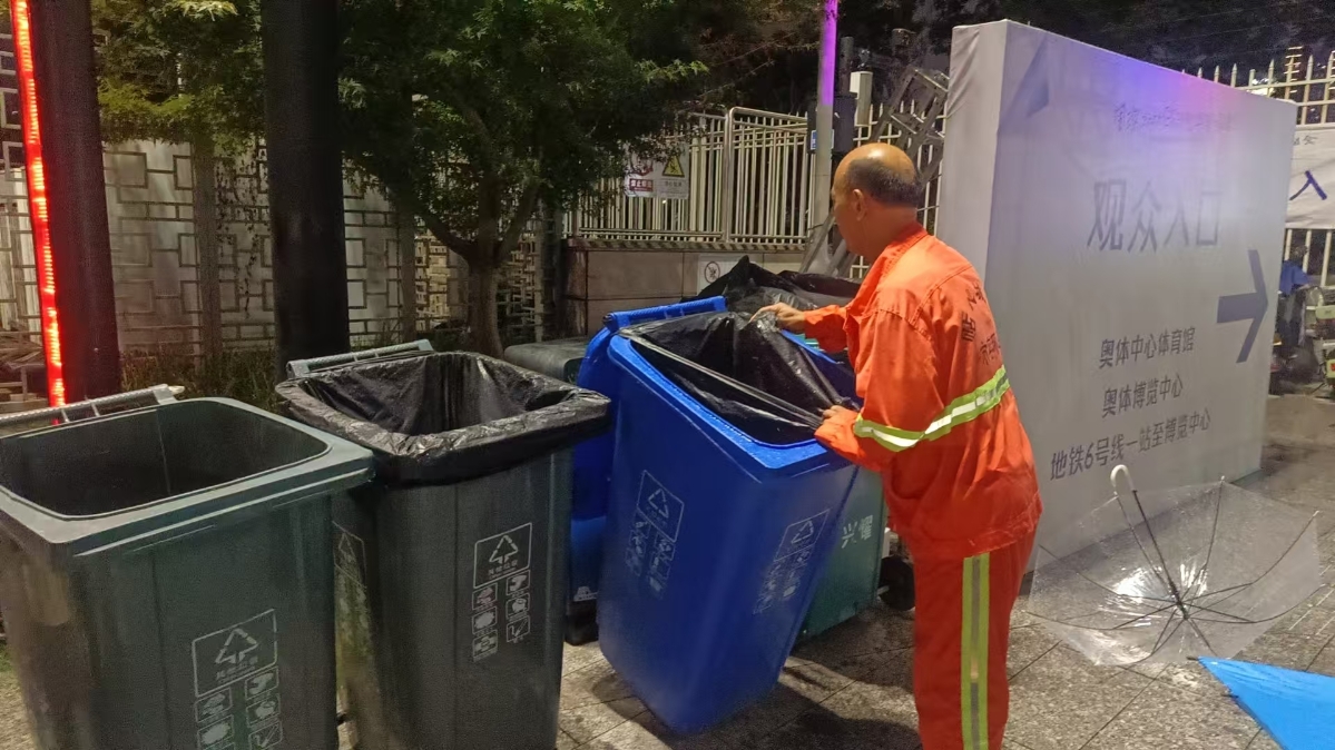 全員上陣,保障現(xiàn)場(chǎng)整潔。活動(dòng)當(dāng)天,根據(jù)預(yù)案部署,增派保潔人員及作業(yè)車輛,并通過增加保潔頻次、細(xì)化分工調(diào)配,確保現(xiàn)場(chǎng)垃圾得到及時(shí)清理。各個(gè)點(diǎn)位配套設(shè)置的分類垃圾桶成為一道隱形防線,保潔人員通過引導(dǎo)觀眾正確投放,大大減輕了后續(xù)清理壓力。